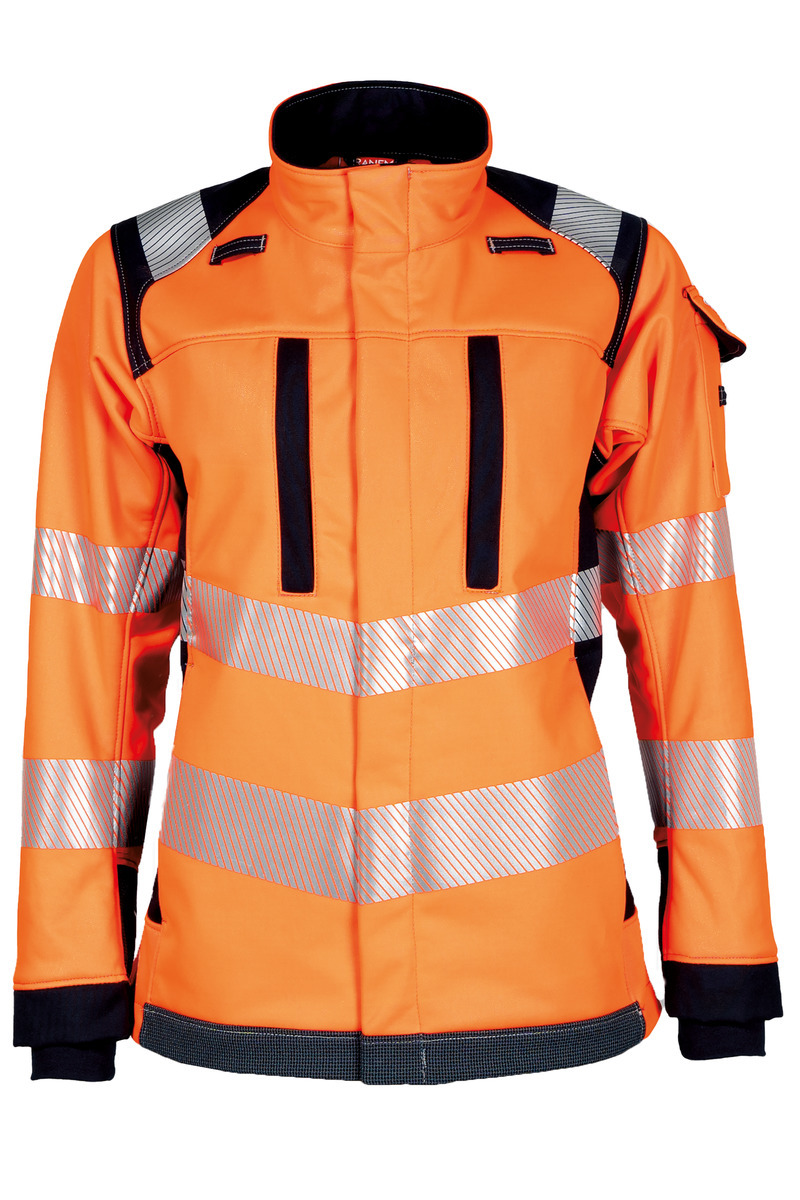 Non-Metal, wind and water resistant Inherent Flame Retardant Hi-Vis ladies softshell jacket with very high comfort. The jacket is ergonomically shaped for working with raised arms. Heat sealed reflective stripes for greater comfort. Concealed front zip and and double storm flap with press studs. Extended back with two side slits for enhanced movement. Two loops for communication equipment. Chest pockets with zip. Side pockets with zip. Left sleeve pocket with flap, hidden keyring holder and strap for ID-pocket. Inside knitted cuffs in sleeves. HTFR Dobby at the bottom of the jacket and on the sleeves. *The jacket has a combined certification and is approved for EN ISO 20471 CL.3 when worn together with Tranemo trousers or bib 'n' brace certified according to EN ISO 20471 CL.1 or CL.2.