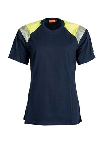Non-metal and Inherent Flame Retardant ladies T-shirt with increased visibility and 20% recycled cotton. Round neck. Reflective detail on shoulders for increased visibility.
