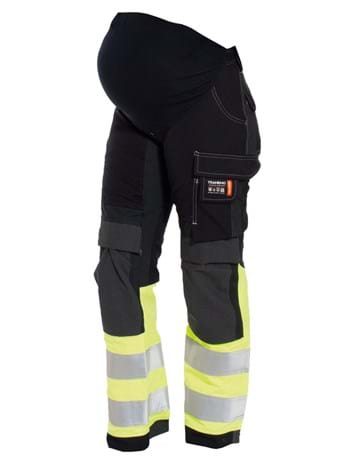 Non-metal and Inherent Flame Retardant maternity trousers with knitted fabric and buttonhole elastic at the top allowing for different stages of pregnancy. The trousers have specific stretch areas and a wide elastic band in the back. Reinforced fly and stretch zones in crotch. Cargo pocket with stretch zone and flap with concealed keyring holder, mobile phone pocket with flap. Ruler pocket with tool pockets and knife button with loop. Shaped knees with kneepad pockets in HTFR Dobby and stretch zones. Back yoke in stretch. Back pockets with pocket flaps. Back hem in HTFR Dobby. Adjustable foot width with press studs.