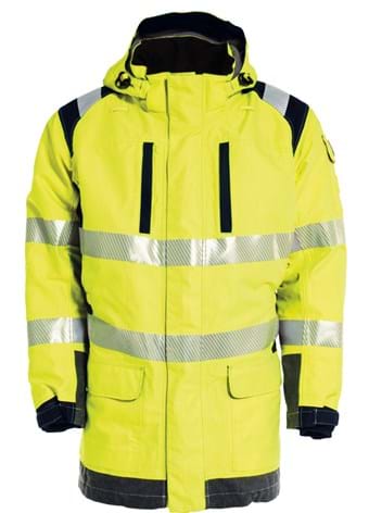 Non-Metal and Inherent Flame Retardant quilted parka with taped seams. Wind and water resistant fabric according to EN 343. The parka is ergonomically shaped for work with raised arms. Concealed front zip and double stormflap with press studs. Detachable and adjustable hood. Two loops for communication equipment. Chest pockets with zip. Keyring holder. Pockets with fleece lining. Front pockets with flaps. Sleeve pocket with flap, hidden keyring holder and strap for ID-pocket. Two inside pockets with zip, one for documents/Ipad with an integrated mobile phone pocket. Adjustable sleeve width and inside knitted cuffs. Drawcord at the waist and bottom of the parka. HTFR Dobby at the bottom of the jacket and on the sleeves. Heat sealed reflective stripes for greater comfort. Fiberfur lining 9128 can be attached. *The garment is tested in a 3 layer system together with basic underwear. Tranemo recommend underwear 5920/5940 and 5980. **Hood must be used or removed during welding or work with chemicals.