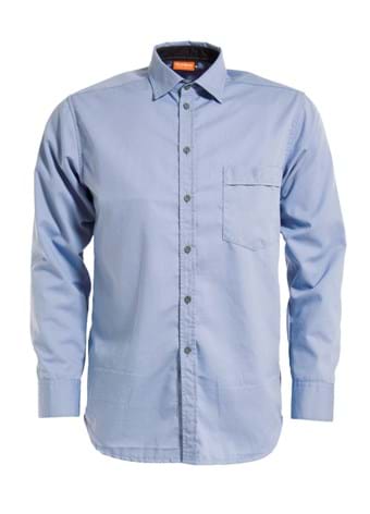Non-Metal and Inherent Flame Retardant office shirt with navy details on the inside of the collar, front placket and cuffs. Shaped fit. Chest pocket on left side. Long sleeves with adjustable cuffs.
