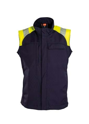 Non-Metal, wind and water resistant Inherent Flame Retardant softshell waistcoat with increased visibility. Heat sealed reflective stripes for greater comfort. Concealed front zip and double storm flap with press studs. Two loops for communication equipment. Left chest pocket with flap. Right chest pocket with zip and hole for microphone. Side pockets with zip. Drawcord at the bottom. *To meet the requirements of the standard, the waistcoat must be worn with a long sleeved garment with the same certification.
