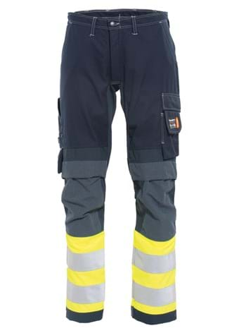 Non-metal and Inherent Flame Retardant trousers with stretch for excellent fit and increased comfort ensuring full mobility at work. Reinforced fly and stretch zones in crotch. Side pockets. Cargo pocket with stretch zone and flap with concealed keyring holder, mobile phone pocket with flap. Ruler pocket with tool pockets and knife button with loop. Shaped knees with kneepad pockets in HTFR Dobby and stretch zones. Back yoke in stretch. Back pockets with pocket flaps. Back hem in HTFR Dobby. Adjustable foot width with press studs.
