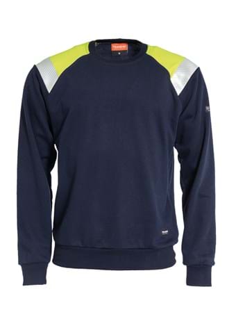 Non-metal, soft and comfortable Inherent Flame Retardant sweatshirt with round neck and increased visibility. 20% recycled cotton. Ribbed neck, cuffs and waistband. Heat sealed reflective stripes for greater comfort.