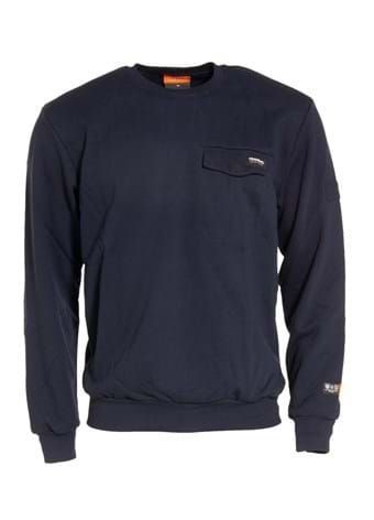 Non-metal, soft and comfortable Inherent Flame Retardant sweatshirt with round neck and 20% recycled cotton. Chest pocket with pocket flap on left chest. Loops for pencils on left sleeve. Knitted cuffs and waistband.