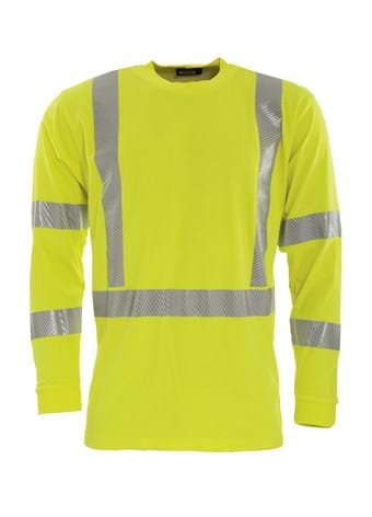 Non-metal and Inherent Flame Retardant Hi-Vis T-shirt with long sleeves in single jersey with 20% recycled cotton. Round neck. Ribbed sleeves. Heat sealed reflective stripes.