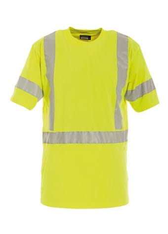 Non-metal and Inherent Flame Retardant Hi-Vis T-shirt in single jersey and 20% recycled cotton. Round neck. Heat sealed reflective stripes. *The T-shirt has a combined certification and is approved for EN ISO 20471 CL.3 when worn together with Tranemo trousers or bib 'n' brace certified according to EN ISO 20471 CL.1 or CL.2.