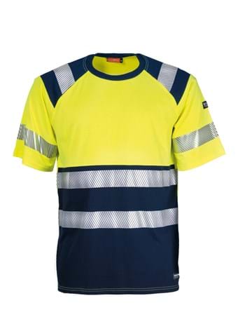Non-metal and Inherent Flame Retardant T-shirt with 20% recycled cotton. Round neck. Heat sealed reflective stripes for greater comfort. *The T-shirt has a combined certification and is approved for EN ISO 20471 CL.3 when worn together with Tranemo trousers or bib 'n' brace certified according to EN ISO 20471 CL.2.