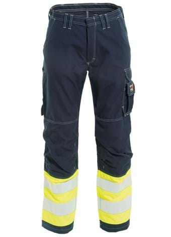 Non-metal and Inherent Flame Retardant Hi-Vis trousers with windproof jersey lining. Side pockets. Back pockets with pocket flaps. Cargo pocket with flap, concealed keyring holder and first aid pocket. Ruler pocket and concealed knife button with loop. Shaped knees with adjustable inside kneepad pockets. Contrast stitching. These trousers have a sewn in lining, size will fit smaller. Special order – please allow an additional 5 days approximately. *The garment is tested in a 3 layer system together with basic underwear. Tranemo recommends underwear 5930 and 5990.