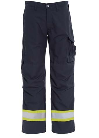 Non-metal and Inherent Flame Retardant trousers with increased visibility in a light fabric with a comfortable feel and good tear resistance. Front pockets. Hip pockets with flaps. Cargo pocket with flap, mobile phone pocket, hidden keyring holder and tool strap. Ruler pocket. Shaped knees with adjustable inside kneepad pockets. Reflective stripes on legs. Special order – please allow an additional 5 days approximately. *If the garment is mainly intended for welding processes, please ask Tranemo for usage advice.