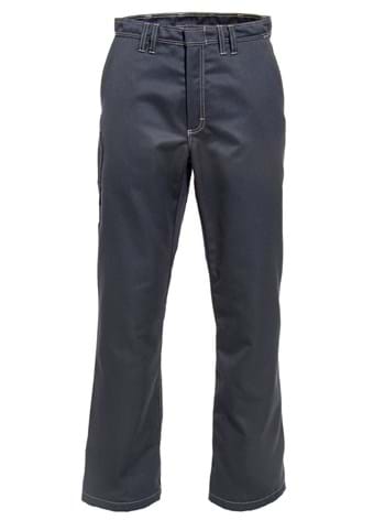Flame Retardant trousers with offset side seams and double fabric in front for extra protection against heat. The trousers are made of a strong and flexible satin customised for work with zinc and chemicals. Front pockets. Hip pockets with flap. Ruler pocket with flap. Contrast stitching.