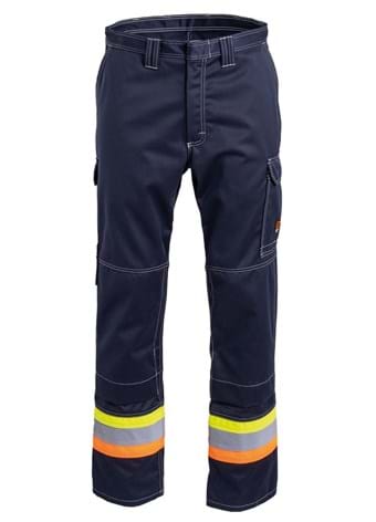 PFAS-free and Inherent Flame Retardant trousers with increased visibility, front in Cantex Weld and back in Cantex Stretch. Front pockets. Hip pockets with flap. Cargo pocket with flap, mobile phone pocket and concealed keyring holder for ID-pocket. Ruler pocket with flap and reinforced bottom. Kneepad pockets with two different placement levels. Adjustable foot width with press studs. Reinforced back hem in Barricader EP. Contrast stitching.