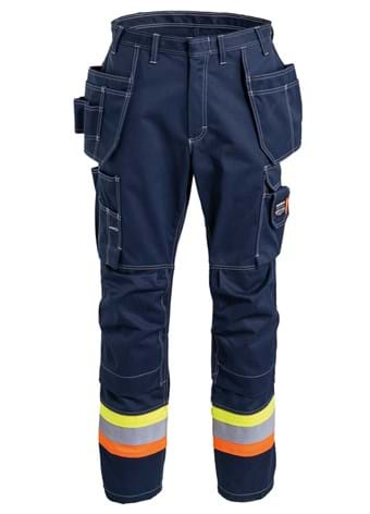 PFAS-free and Inherent Flame Retardant ladies trousers with increased visibility, nail pockets, front in Cantex Weld and back in Cantex Stretch. Double tool pockets with tool strips. Side pockets. Back pockets. Hammer loops. Left cargo pocket with flap, mobile phone pocket, pencil pocket and concealed keyring holder. Right cargo pocket with an extra tool pocket, ruler pocket with concealed knife button with loop. Kneepad pockets with two different placement levels. Adjustable foot width with press studs. Reinforced back hem in Barricader EP. Contrast stitching.