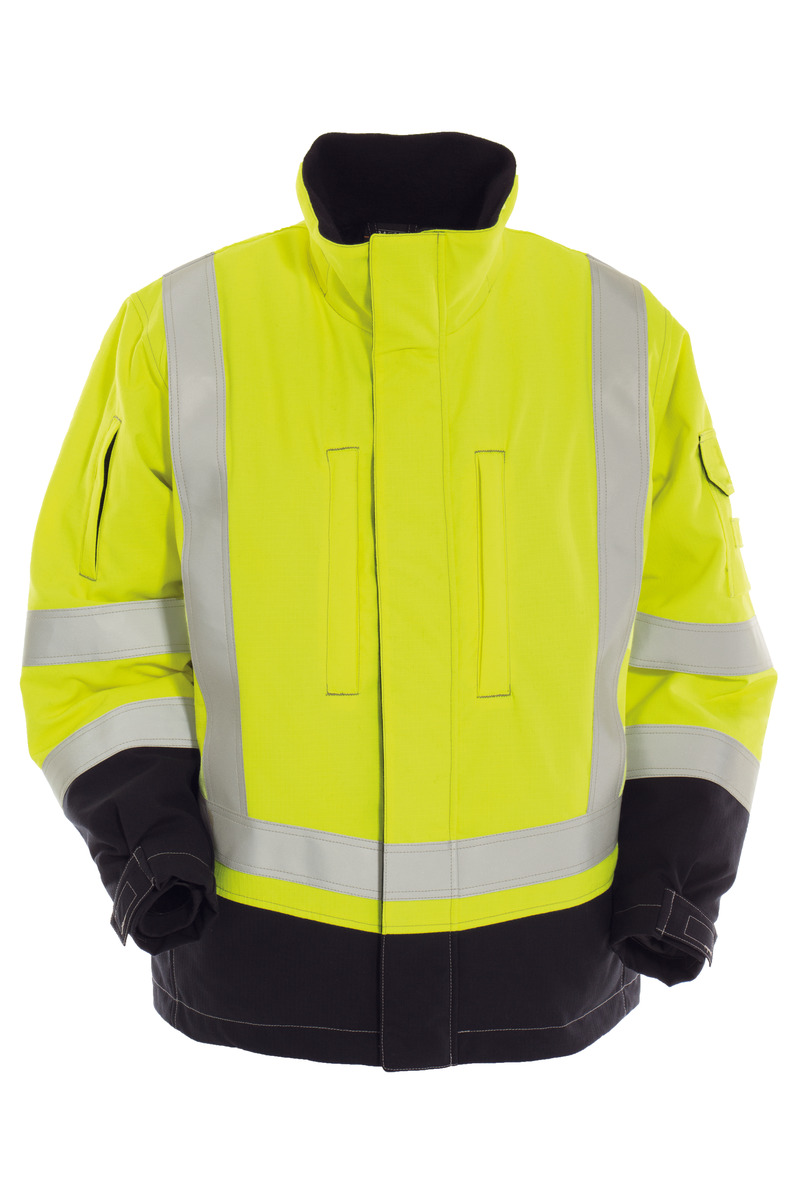 Non-metal and Inherent Flame Retardant Hi-Vis winter jacket with vertical chest pockets, fiberfur lining in body and quilt lining in sleeves. Hidden zip and stud fastener in front. Vertical chest pockets with zip. Vertical side pockets with fleece lining. Left sleeve pocket with flap, hidden keyring holder and strap for ID-pocket. Right sleeve pocket with zip. Two inside pockets with zip, one for Ipad/documents. Wind stoppers in sleeves. Adjustable cuffs. Draw cord at the bottom of the jacket. Zip access for back heat seal badges. Buttons for attaching hood 9065 81. Fleece on the inside of the collar. *The garment is tested in a 3 layer system together with basic underwear. Tranemo recommends underwear 5920/5940 and 5980.