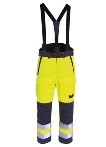 Non-Metal and Inherent Flame Retardant Hi-Vis winter trousers with taped seams and quilt lining. Wind and waterproof according to EN 343. Removable braces with fixed lock closing. High back with fleece lining for extra protection. Loops in waist. Side pockets with zip. Front pockets with flaps and keyring holder in the right pocket. Inside kneepad pockets. Concealed two-way zip in legs. Snow barrier in legs and adjustable ankle width.