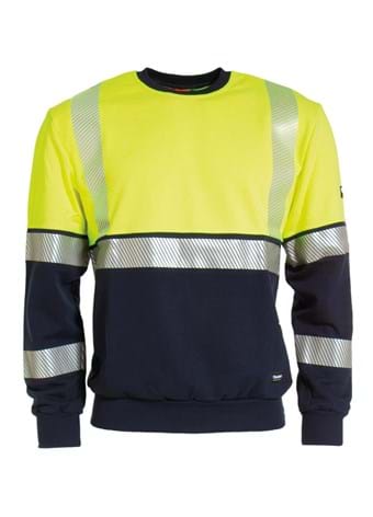 Inherent Flame Retardant sweatshirt with round neck and 20% recycled cotton. Knitted cuffs and waistband. Heat sealed reflective stripes for greater comfort. *The sweatshirt has a combined certification and is approved for EN ISO 20471 CL.3 when worn together with Tranemo trousers or bib 'n' brace certified according to EN ISO 20471 CL.2.