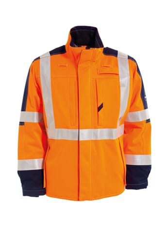 Inherent Flame Retardant Hi-Vis winter jacket with quilt lining and taped seams. Concealed zip and stud fastener in front. Two loops for communication equipment. Vertical chest pockets with zip and hidden keyring holder. Vertical side pockets with fleece lining and pocket flaps. Wind stoppers in sleeves. Quilted lining and fleece in collar. Two inside pockets. Buttons for accessory 9062 82 50 radio pocket. *The garment is tested in a 3 layer system together with basic underwear. Tranemo recommends underwear 5920/5940 and 5980.