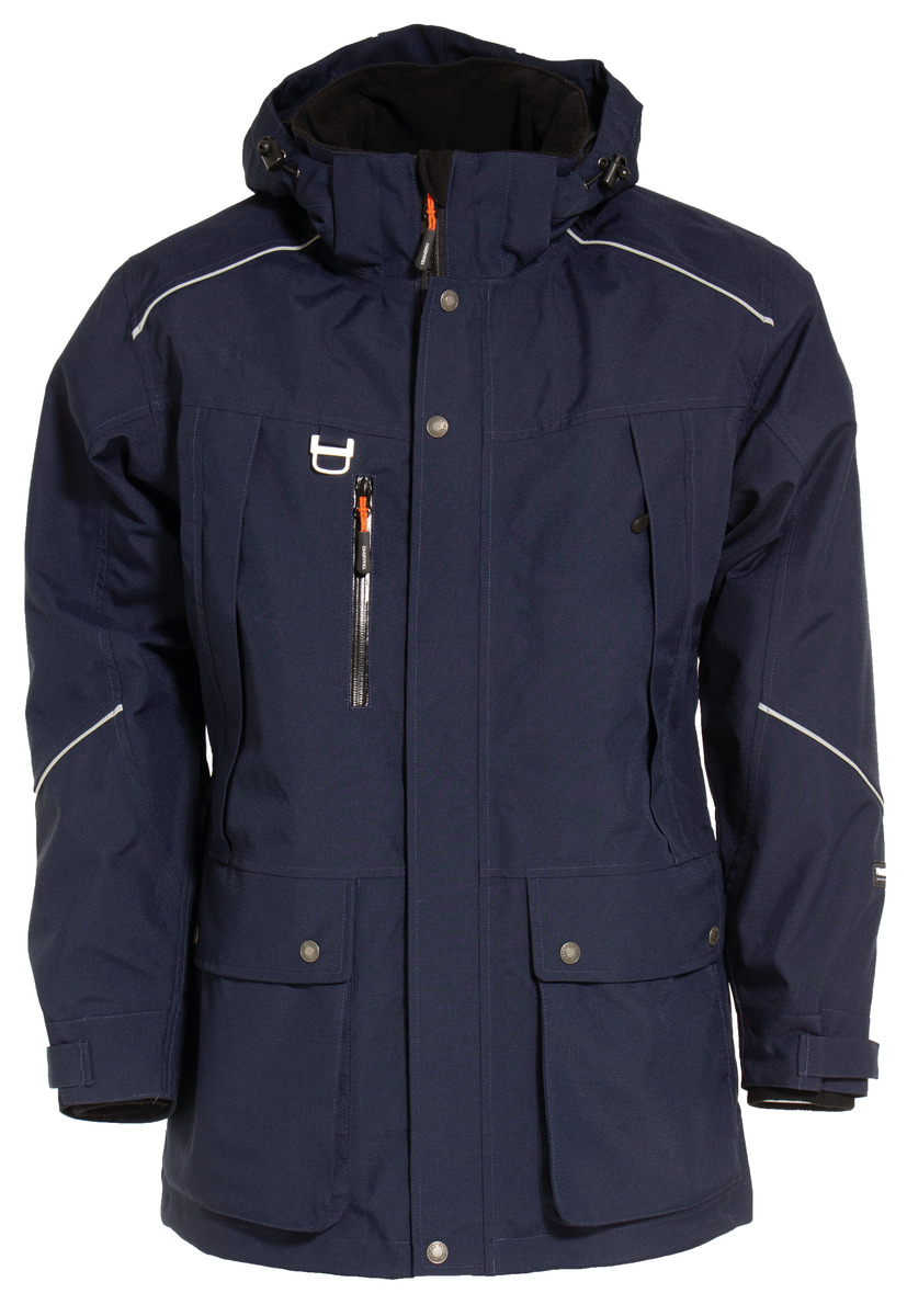 Parka with taped seams and detachable fleece lining. Wind and waterproof according to EN 343. Outer fabric EN 343 4:4. Double flap with press studs over two-way front zip. Chest pocket with zip. Keyring holder. Side pockets with fleece lining and zip. Front pockets with zip. Large safety pocket under storm flap. Ventilation on the back. Adjustable cuffs with inside knitted cuffs. Draw cords at waist and bottom of jacket. Reflective details on shoulder, back, sleeve and hood. Detachable and adjustable hood. Detachable fleece lining with inside pocket and quilted sleeves.