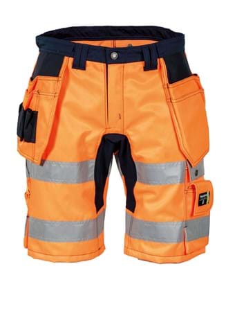 High-Visibility shorts with stretch for excellent fit and increased comfort ensuring full mobility at work. Nail pockets reinforced with HTPA. Reinforced fly and stretch zones in crotch. Side pockets. HTPA reinforced tool pockets with tool strip. Cargo pocket with flap and concealed keyring holder, mobile phone pocket with flap. Ruler pocket with tool pocket and knife loop. Stretch seat. Hip pockets.