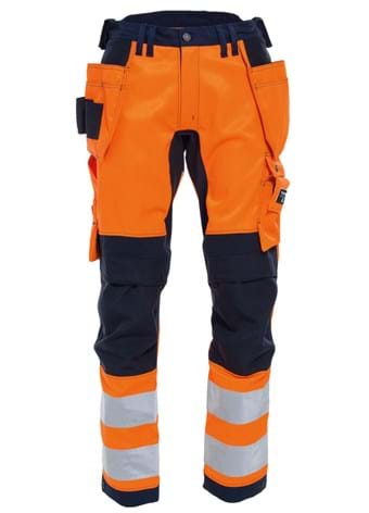 High-Visibility ladies trousers with nail pockets, kneepad pockets and stretch for excellent fit and increased comfort ensuring full mobility at work. Reinforced fly and stretch zones in crotch. Side pockets. HTPA reinforced tool pockets with tool strip. Loops for multiple tools in waist. Side pockets. Cargo pocket with flap and concealed keyring holder, mobile phone pocket with flap. Ruler pocket with tool pocket. Shaped knees with kneepad pockets in HTPA Dobby and stretch zones. Back yoke in stretch and hip pockets. Back hem in HTPA. Adjustable foot width with plastic press studs. *Garments in colour 93, certified to EN ISO 20471 class 2 complies with RIS-3279-TOM.