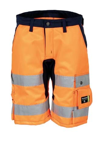 High-Visibility shorts with stretch for excellent fit and increased comfort ensuring full mobility at work. Reinforced fly and stretch zones in crotch. Side pockets. Cargo pocket with flap and concealed keyring holder, mobile phone pocket with flap. Ruler pocket with tool pocket and knife loop. Stretch seat. Hip pockets.
