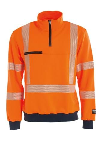 Soft, High-Visibility sweatshirt with an unbrushed finish on the inside. Zip in collar. Zip pocket at chest. Heat sealed reflective stripes.