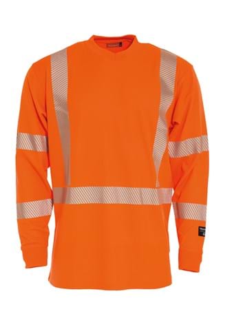 Soft and shape retaining High-Visibility T-shirt with long sleeves in tricot and a cotton finish on the inside for comfort. Hi-Vis T-shirt with long sleeves with v-neck. Ribbed sleeves. Heat sealed reflective stripes.