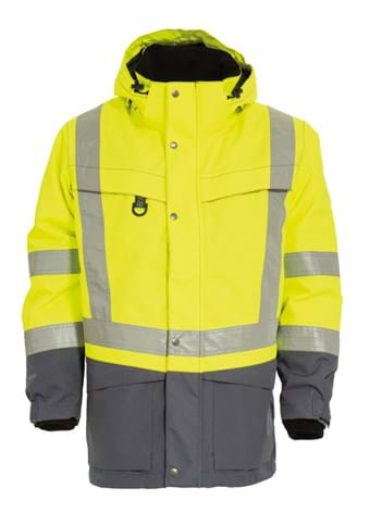 High-Visibility parka with taped seams and quilted lining. Wind and waterproof according to EN 343. The parka also has a detachable fleece/quilt lining. Thin quilted lining and detachable lining with fleece in body and quilted sleeves. Detachable hood. Two-way zip closing with storm flap. Chest pockets with velcro closing and keyring holder. Two concealed pockets with zip, one for document/Ipad and one for mobile phone, under storm flap. Inside pockets with zip. Front pockets with flap. Draw cords at the waist and bottom of the jacket. Zip in access for back heat seal badges. Adjustable cuffs and inside knitted windstopper. *The garment is tested in a 3 layer system together with basic underwear. Tranemo recommends underwear 6975/6979 and 6930.