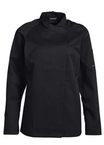 135012000This lady chefs/servant jacket has a simple and lightweight design, it is with chinese bucket, neck strap for bang apron, hidden push buttons, diagonal thread direction under sleeves, which gives string effect. It has long sleeves in an ergonomic cut, two-piece pen pocket on the left sleeves, cuffs and easy pull-up function.