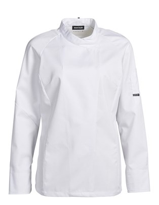 13501410000This lady chefs/servant jacket has a simple and lightweight design, it is with chinese bucket, neck strap for bang apron, hidden push buttons, diagonal thread direction under sleeves, which gives string effect. It has long sleeves in an ergonomic cut, two-piece pen pocket on the left sleeves, cuffs and easy pull-up function.