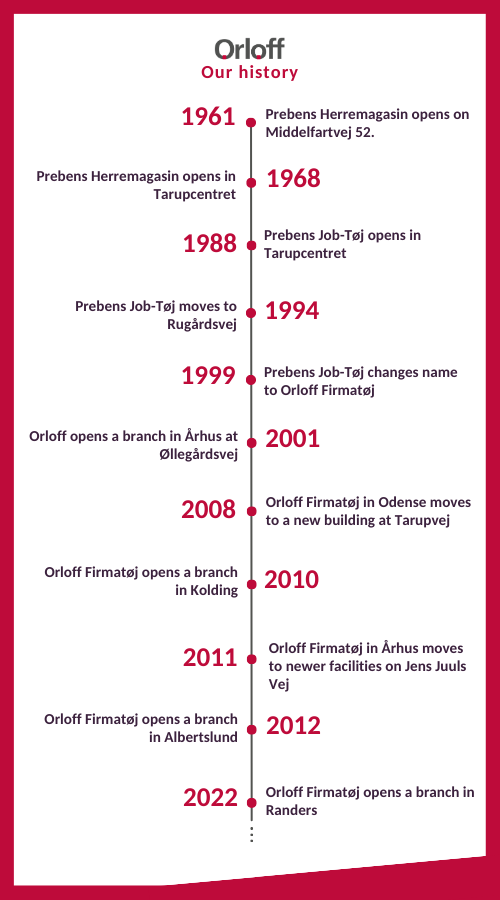 Read the story below about how Preben Orloff Lauridsen started it all back in 1961 and how Orloff has evolved into what it is today; one of Denmark's largest suppliers of workwear, profile clothing, footwear and personal protective equipment.