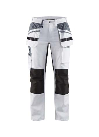 7910-1000-1099Modern and comfortable painter ntrousers tailored for women, with tool pockets, outside knee pockets and stretch zones on crotch, knee, seat and calf areas for increased flexibility and comfort. The fabric has excellent absorption properties thanks to the high percentage of cotton. The trousers feature many functional pockets and a specially-designed, reinforced paint tool pocket. The paint tool pocket, nail pockets and back pockets are reinforced with CORDURA® fabric and the knees with stretch CORDURA® for enhanced comfort.