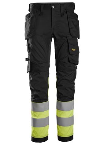 6234-0466Comfortable class 1 high visibility work trousers with holster pockets and slim fit fit for tradesmen working in construction, roadworks or transport.