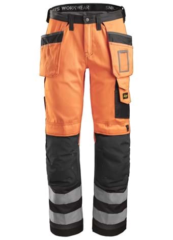 Fluorescent work pants with hollow pockets, which are ideal for everyday use. The pants are visible in dangerous environments and offer personal protection, reliable work comfort, abrasion resistance and flexibility.