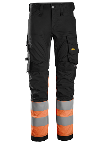 Comfortable high-visibility Class 1 work trousers with slim fit for craftsmen working in the general construction sectors, roadworks and transportation.