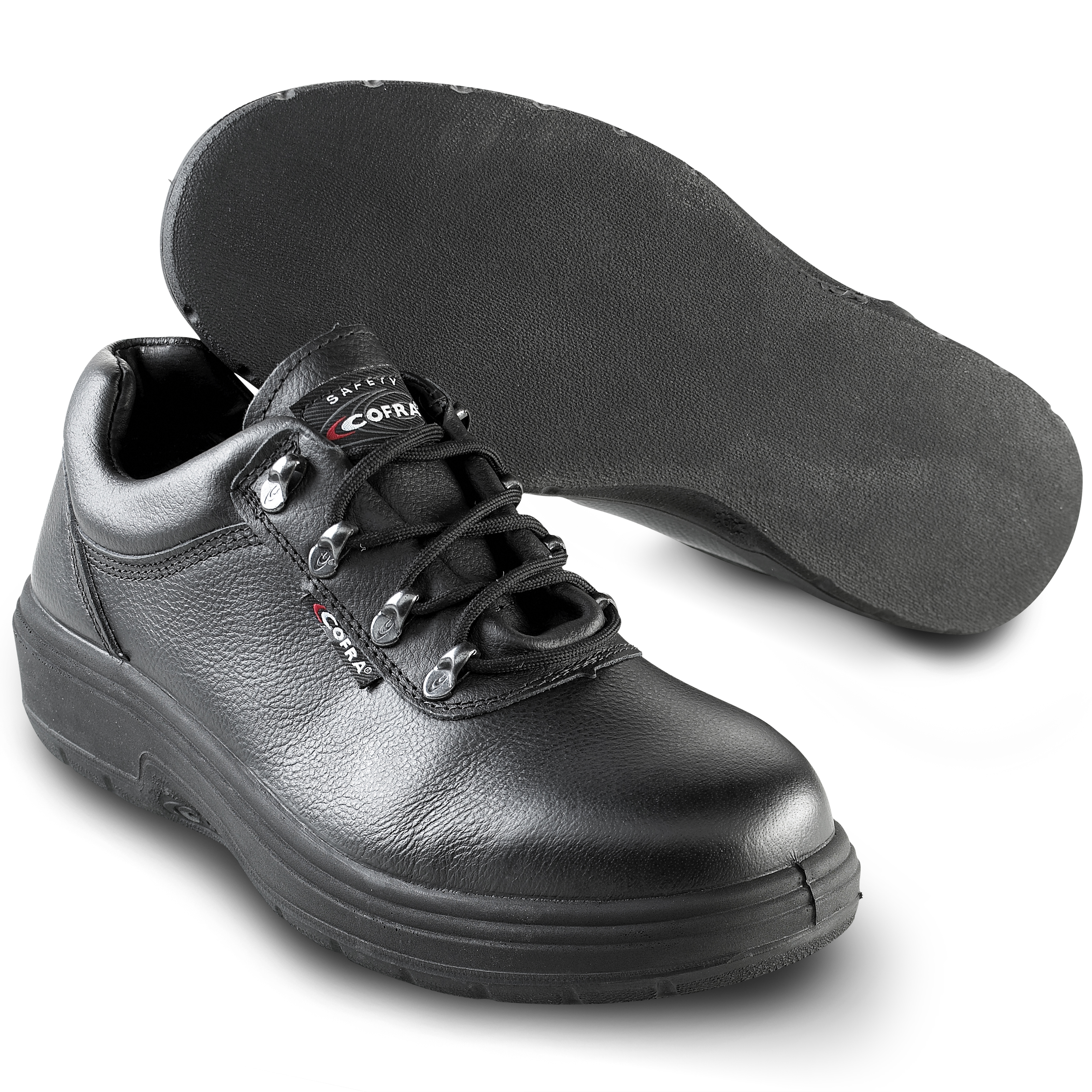 82070-10Asphalt shoe with extra slip and heat resistant PU outsole made from PU/nitrile rubber, which is heat resistant up to 300 °C (HRO). The outsole has no pattern, so that footprints are not left in hot asphalt. Made from water resistant leather, with an insole that insulates and protects against high temperatures