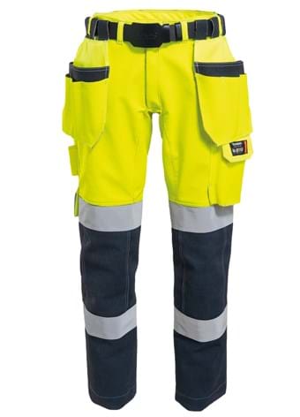 Inherent Flame Retardant rail cutting trousers extra reinforced with Barricader fabric which provides a high protection against metal splashes. The back of the trousers have Cantex Stretch fabric for increased comfort. Leather belt. Nail pocket in Barricader. Front pockets. Hip pockets with flap. Cargo pocket with flap, mobile phone pocket and concealed keyring holder. Ruler pocket with knife button and loop*. Inside kneepad pockets with two different placement levels. Contrast stitching.