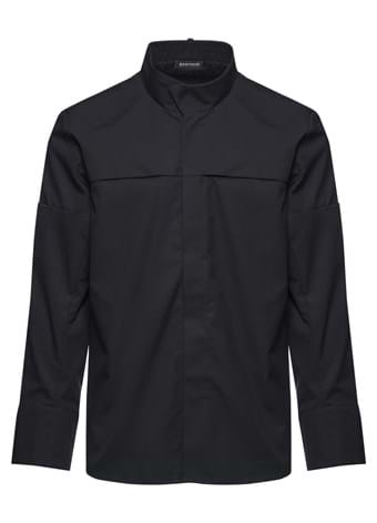 Integrated pen pocket on the left sleeve, hidden push buttons for snap -on apron, neck strap for slack apron.