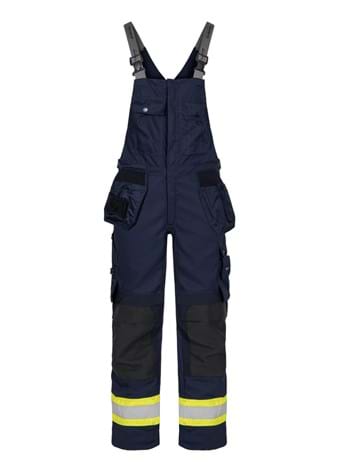 Adjustable braces with fixed lock closing. Front zip closing. Right chest pocket with flap. Left chest pocket tool pockets. Knife buttons with knife loop. Adjustable width and loops in waist. Side pockets. HTPA Dobby lined nail pockets with loop strip for hanging multiple tools. 4-way stretch in crotch, around knee and in seat. Cargo pocket with flap, mobile phone pocket and concealed keyring holder for ID pocket. Ruler pocket with tool pockets and pen pockets. Kneepad pockets in HTPA Dobby. Hip pockets.