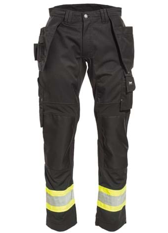 Craftsman Trousers with increased visibility and stretch zones for perfect fit, reinforced nail pockets and kneepad pockets in HTPA Dobby. Reinforced fly and stretch zones in crotch. Side pockets. HTPA Dobby lined nail pockets with loop strip for hanging multiple tools. Cargo pocket with flap, concealed keyring holder, mobile phone pocket stretch zone and flap. Ruler pocket with tool pockets and knife loop. Inside kneepad pockets. HTPA Dobby and stretch zones at knee. Stretch in seat. Back pocket. Back hem in HTPA Dobby with reflective detail. Adjustable foot width with plastic press studs.