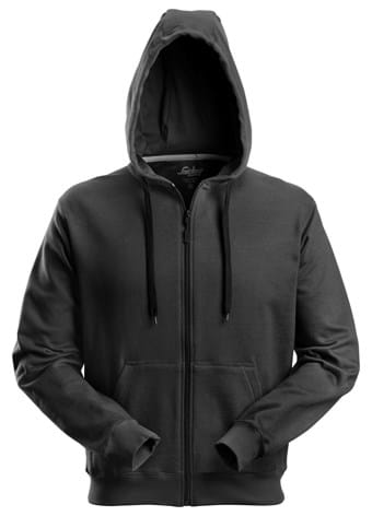Robust and simple hoodie with zipper and pockets to warm hands in. Good space for company profiling.