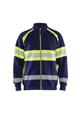 Soft and comfortable high vis sweater in lovely cotton quality with cut reflective tape for extra good stretch abilities and breathability. Has pockets on the sides, high collar, full zip at the front and cuffs at the bottom and sleeve ends for higher comfort. The dark part of the sweater consists of 100 per cent cotton, and the high vis part is made of 100 per cent polyester. Certified according to EN ISO 20471, class 1.