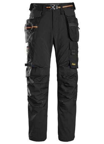 Wind-protective work pants with body-adapted stretch panels that provide freedom of movement and working comfort all day in windy conditions.