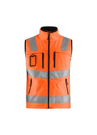 Modern Softshell vest in Hi-Vis colors with a waterproof and breathable fabric. The vest has a high collar and a soft fleece lining. Certified according to EN 20471 for improved visibility at work.