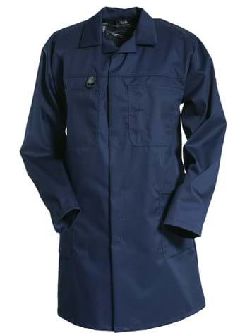 Warehouse coat in a lightweight but durable polyester/cotton twill. Concealed press studs. Two chest pockets with pencil pocket on left. Keyring holder. Front pockets. Inside pocket. Vent at the back.