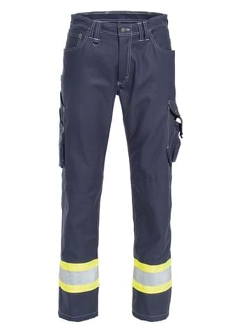 Smart worker jeans with increased visibility in a durable and heavyweight cotton twill and inside kneepad pockets. Side pocket. Keyring holder. Hip pockets. Cargo pocket with flap and mobile pocket. Ruler pocket. Hammer loop. Inside kneepad pockets. Contrast stitching. Pre-Washed.