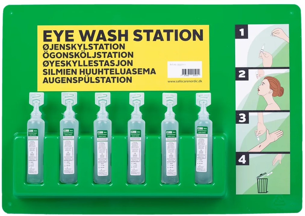 338.00Tavle til vægmontering. Øjenskyl 30 ml. steril natriumklorid 0,9% saltvandsopløsning leveres i en rund ampul med skylletud, hvilket gør at den er nem at presse sammen. Twist-off hætten gør det let at åbne ampullen. Er klar til brug og giver en jævn stråle. Anvendes til skylning af øjne, små sår, instrumenter og til fugtning af kompresser. Indhold: 6 flasker á 30ml med steril 0,9% isotonisk natriumklorid opløsning. Opfyldning: 95502-1 Refill til øjenskylstation.