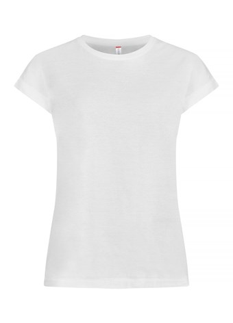 En moderne t-shirt med en afslappet pasform og forlænget skuldersnit. Kraven er et dobbelt skalstofmateriale, forstærket nakketape. En let aftagelig nakkelabel til ommærkning.