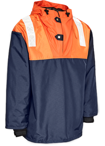 Minimumsbestilling: 5 stk. pr. str.Hætte med snøretrækBusseronne i dobbelt lagRipstop yder mateiralePU materiale inder materialePrismatic refleks på skulder2 trykknapper i halsåbningNeopren manchet i ærmevindfang m. hook and loop reguleringFiskeolie-resistent og kuldebestandig