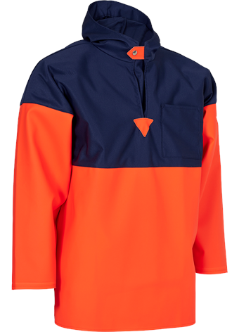 Trykknap i halsDobbeltsvejsede sidesømmeSvejsede opsøm i ærmerBrystlommeFiskeolie-resistent og kuldebestandig PVC